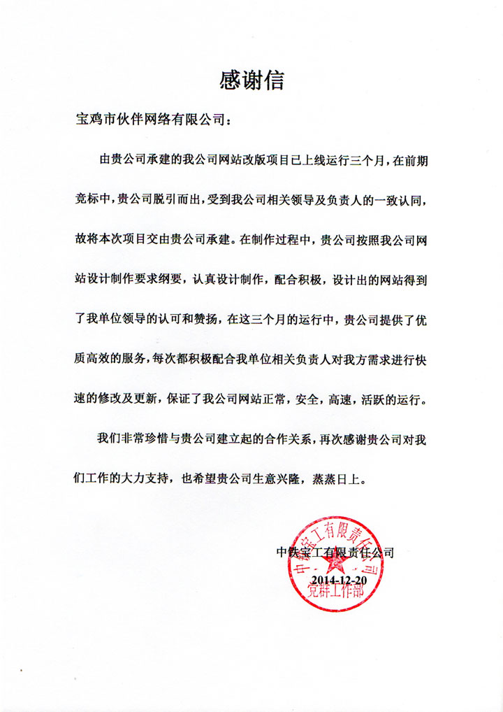 您現(xiàn)在的位置: 寶雞網(wǎng)絡公司 > 新聞動態(tài) > 公司動態(tài) > 我公司收到中鐵寶工感謝信